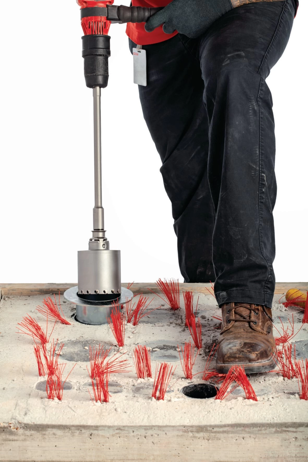 Protects firestop material after fastening it to metal deck – so you can cut openings in the deck through the cast-in device