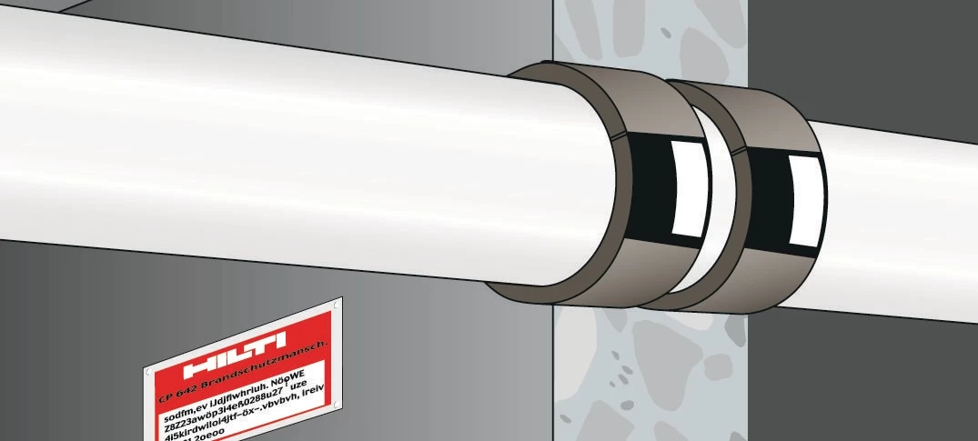 Pre-cut, intumescent, flexible firestop wrap strip to help create a fire and smoke barrier around combustible pipe penetrations