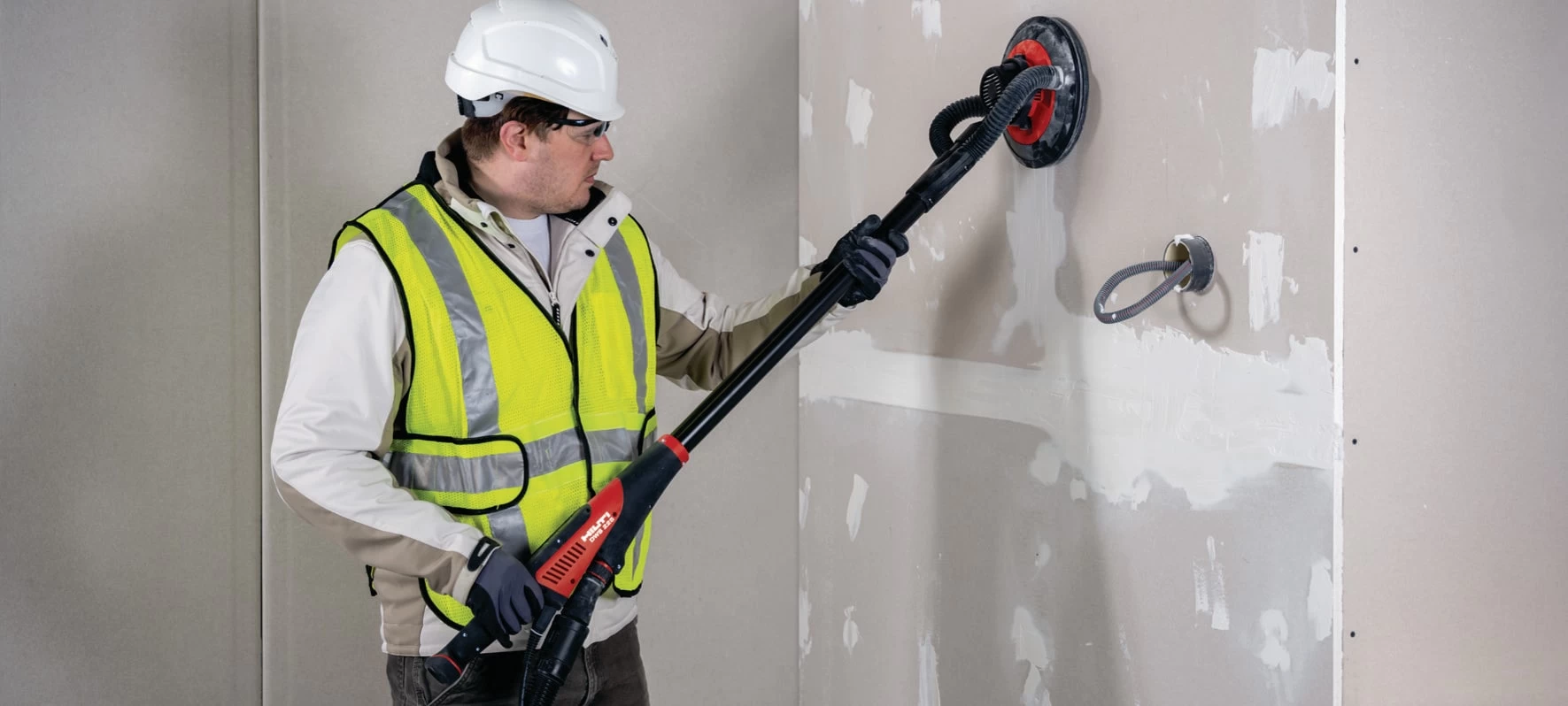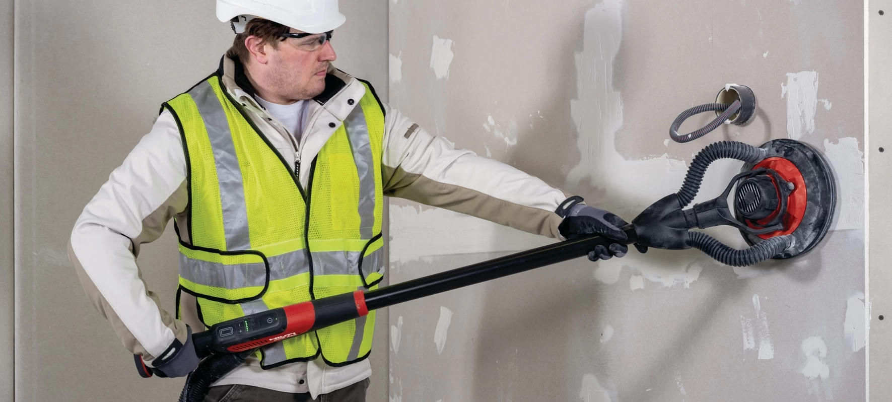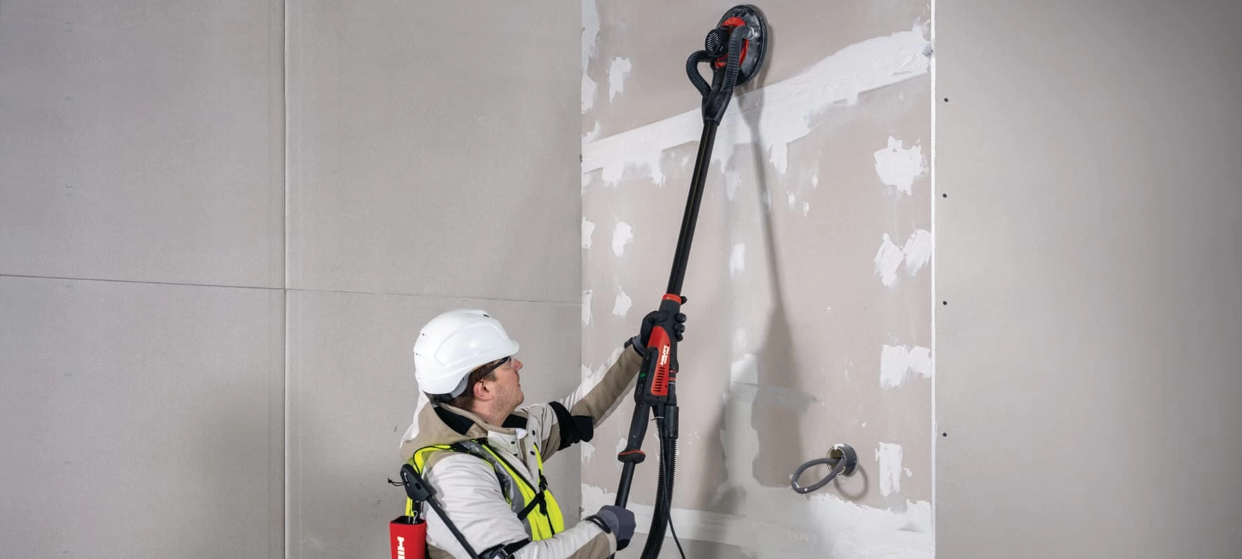 Sanding drywall, gypsum and plasterboard filler – variable speed motor gives you better control over surface finish and removal rate