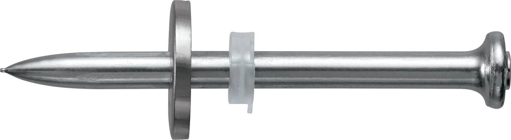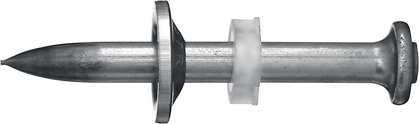 Stainless steel single nail with steel washer for use with powder-actuated nailers on steel and concrete in corrosive environments